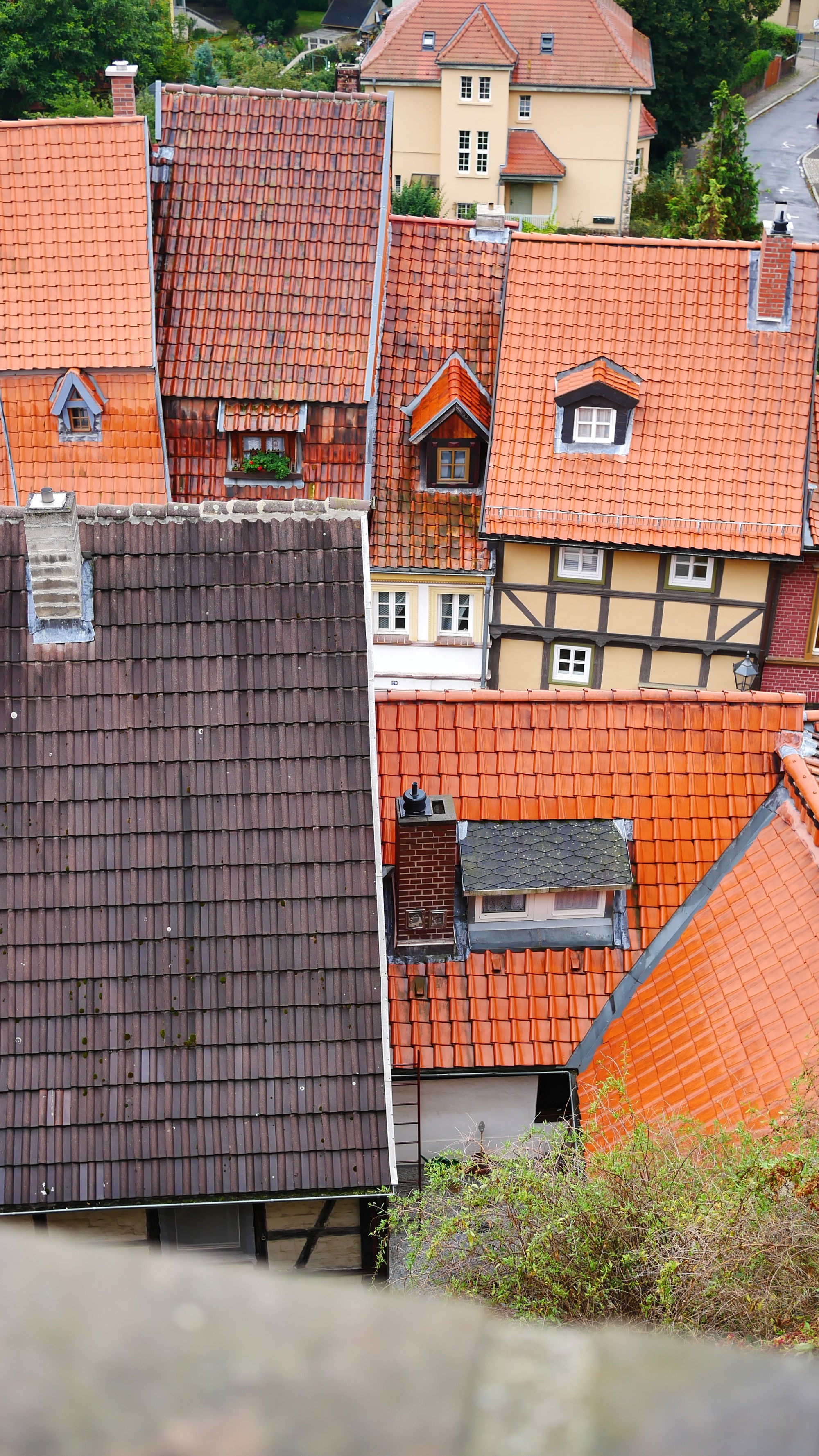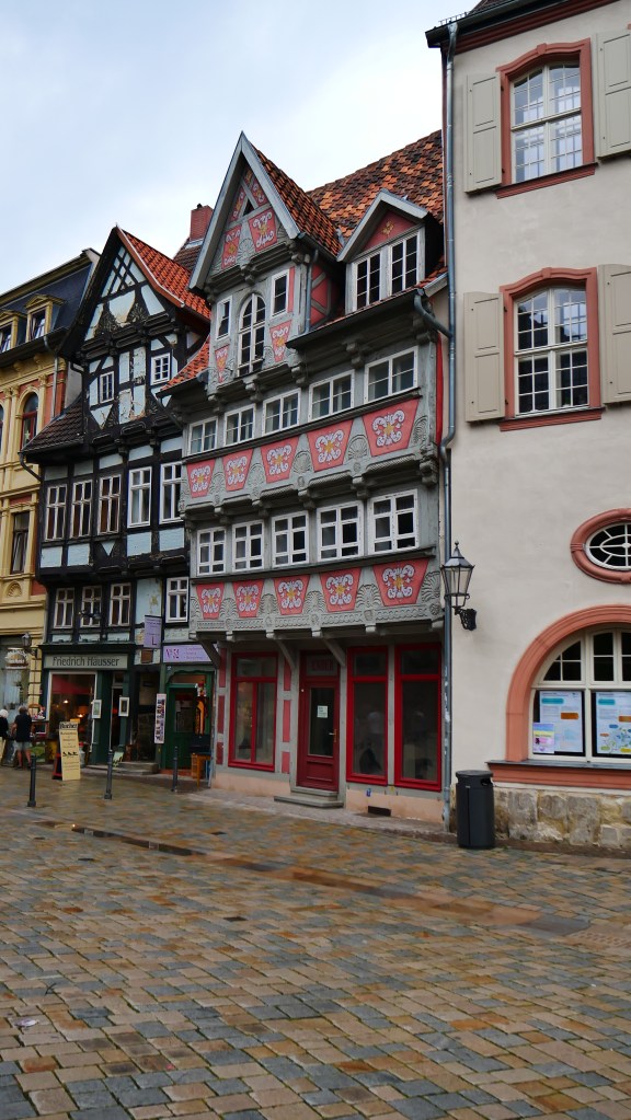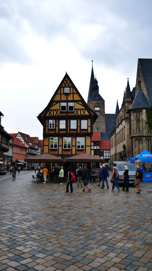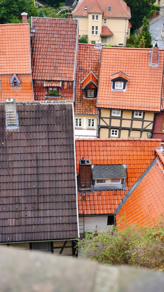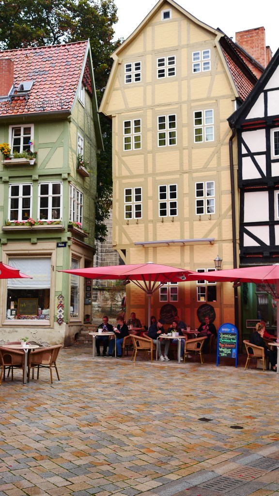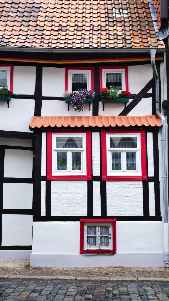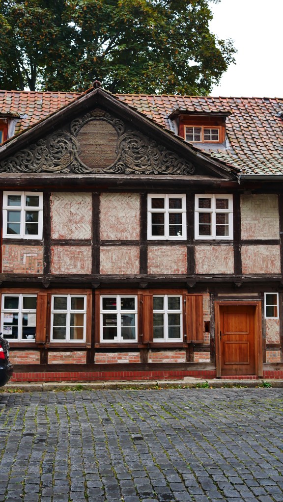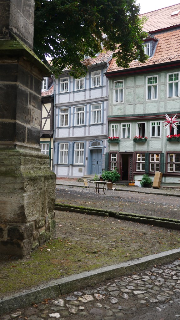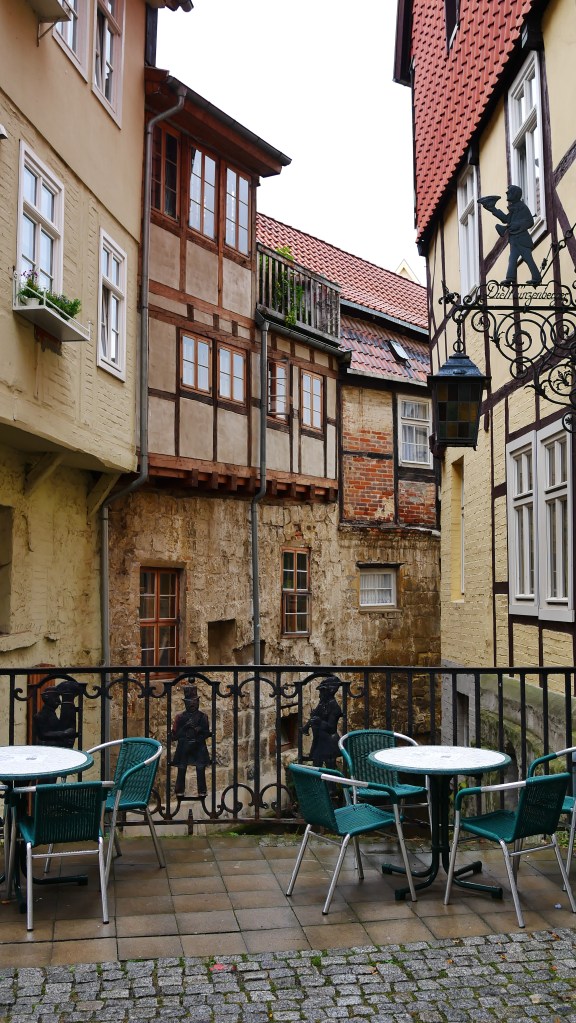 Tym miejscem był Quedlinburg. Nazwę tego miasta pierwszy raz spotkałem w powieści „Ojciec i syn” Karola Bunscha. W jednym z rozdziałów opisany jest udział księcia Polan Mieszka I na zjeździe w Quedlinburgu. Podczas tego zjazdu zwycięzca spod Cedyni musiał oddać swojego syna Bolesława jako zakładnika. O ile pobyt Mieszka I był fikcją literacką to pozostałe wydarzenia są faktami. Polecam cykl piastowski Karola Bunscha fascynujący obraz historii Polski czasów pierwszych Piastów. Quedlinburg powstał w 922 roku z inicjatywy Henryka I Ptasznika. I od początku stanowiło ważny ośrodek religijny i państwowy. Przez wieki korzystając z wielu przywilejów królewskich mogło bogacić się na handlu , a to bogactwo widać jeszcze teraz w zabudowie wąskich uliczek. To bajkowa kraina pełna deseni, kolorów, wzorów. Mnóstwo tu zaułków, wykuszy, ganków, wąskich przejść – jednym słowem szachulcowa kraina z baśni braci Grimm. Można bez końca krążyć po tych uliczkach, podwórkach, placach napawając się tą paletą barw i kształtów. Imponujące jest to że w tym mieście jest ponad 1300 domów zbudowanych techniką tzw. „pruskiego muru” czyli domów szachulcowych. Większość z nich pochodzi z XVII wieku co lokuje je jako domy renesansowe, choć Mnie bardziej pasują do średniowiecza. Wierzę, że uda się jeszcze raz zobaczyć Quedlinburg i być tam o świcie i zachodzie słońca, bo wtedy pogoda nie dopisała, co w żaden sposób nie umniejszyło fascynującego piękna tego miasta.