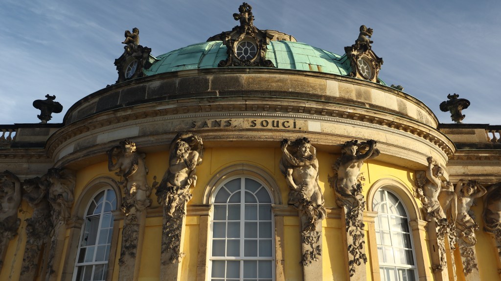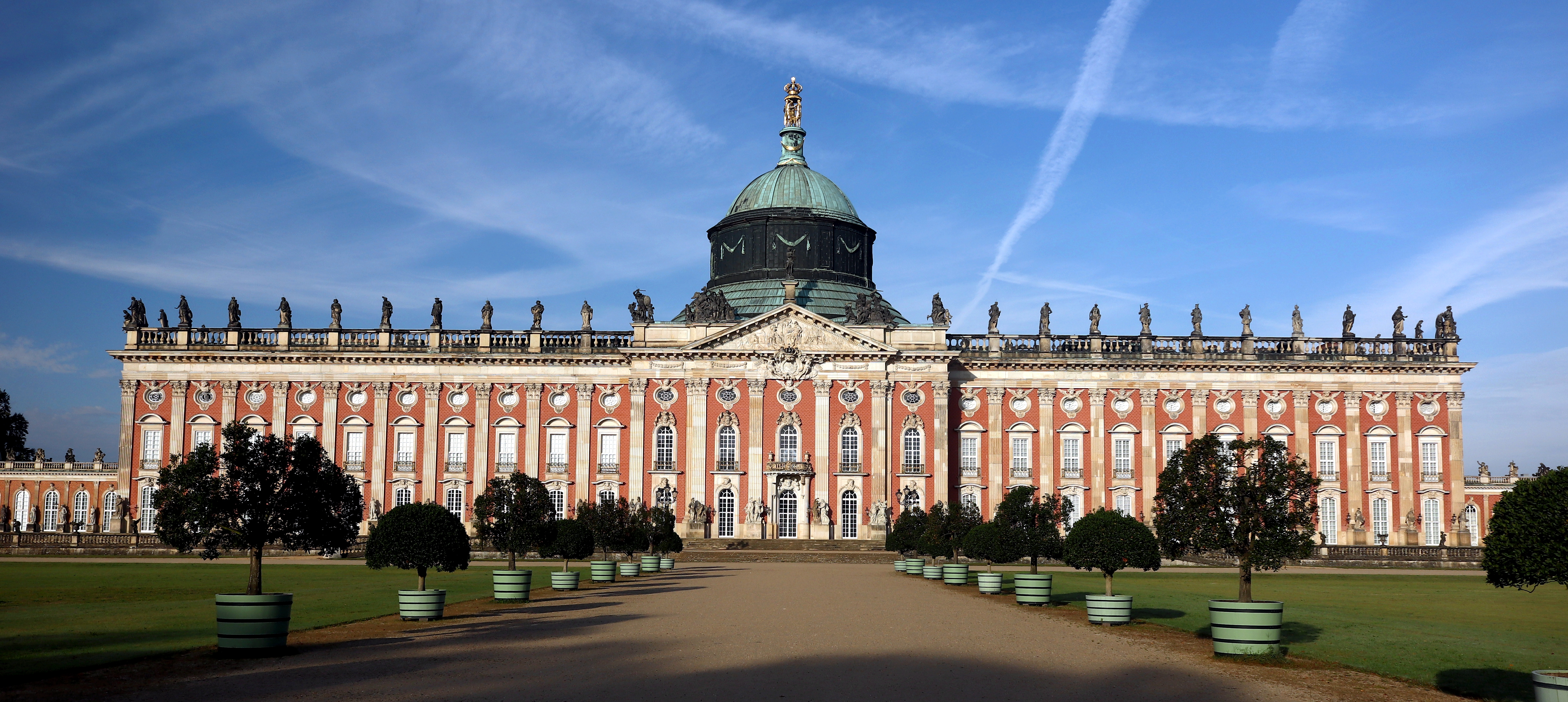 Nowy Pałac – myślę, że chyba dla niego wymyślono słowo monumentalny. Cały jego kompleks jest ogromny. Fioletowo-różowy odcień fasady kontrastuje z kilkudziesięcioma rzeźbami inspirowanymi bohaterami starogermańskich mitów. Dziedziniec główny ograniczony jest dwoma potężnymi budynkami tworzącymi ,,bramę,,. Trudno było to objąć ,,szerokim,, kątem aparatu. Niesamowite wrażenie. Byłem zafascynowany ogromem założenia parkowego. Park był mieszaniną stylów. W okolicy zamku Sanssouci park był w stylu francuskim, a przy Nowym Pałacu angielskim. Wychowany w najpiękniejszym parku świata czyli Pszczynie , wolę swobodę angielskiego stylu od francuskiej ogrodowej ,,geometrii,,. Zamek Sanssouci zbudowano w latach 1745 do 1747 na polecenie Fryderyka II Wielkiego. Umiejscowiono go na tarasach na wzniesieniu powstałym po wykarczowaniu dębów potrzebnych do umocnienia terenów bagiennych pod rozbudowę Poczdamu. Ciekawostką jest że, inicjator budowy kompleksu Fryderyk II został pochowany na najwyższym tarasie zamku Sanssouci , w którym mieszkał w miesiącach letnich , naturalnie wtedy kiedy nie był zajęty prowadzeniem wojen. Ten sam Fryderyk zwany Wielkim był sprawcą budowy Nowego Pałacu , którego powstanie datujemy na rok 1763 a zakończenie budowy 1769. Pałac Nowy to demostracja potęgi Prus po zakończonej wojnie siedmioletniej, miał pełnić rolę domu gościnnego, budynki gospodarcze z mieszkaniami dla służby tak zwany Communs chyba też pokazują potęgę Prus : ) W latach 1871 do 1918 nowy Pałac pełnił rolę rezydencji cesarskiej. Zarówno zamek Sanssouci i Nowy Pałac znajdują się na liście zabytków dziedzictwa światowego UNESCO.