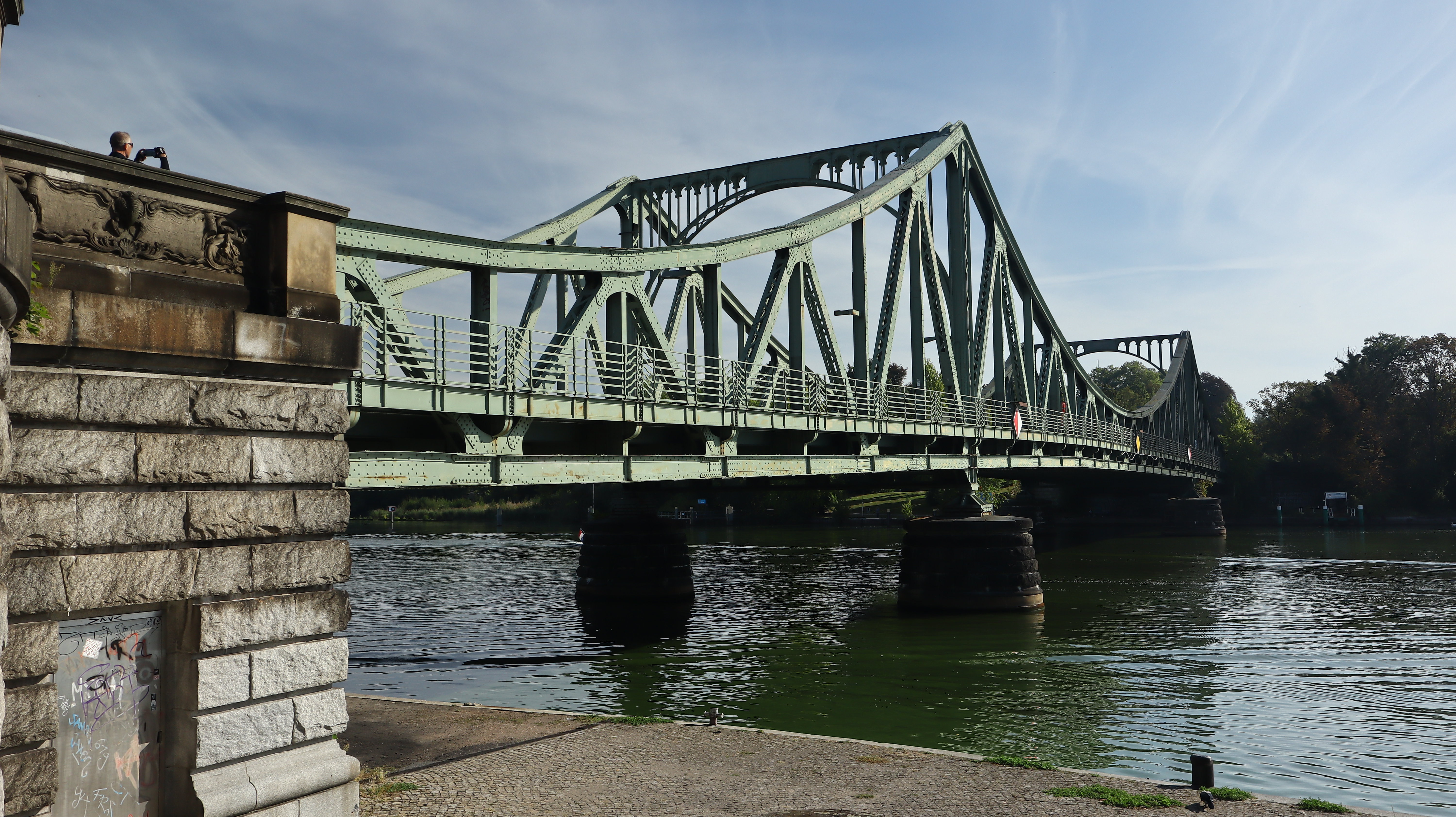 Glenicker Brücke – tego miejsca nie chciałem ominąć. Relikt czasów ,,Zimnej Wojny,, i Berlińskigo Muru. Most był w przeszłości mostem granicznym między krajem proletariackiej szczęśliwości zwanym NRD a krajem rewizjonistów NRF ( to nie błąd ja pamiętam taka oficjalną pisownię ). Na tym mości służby specjalne wszystkich krajów dokonywały wymiany agentów. Nieoficjalną nazwą tej budowli brzmi ,,Most Szpiegów,,. Co prawda wymian było trzy a najsłynniejszym ,,agentem,, tam wymienionym był Francis Gary Powell pilot szpiegowskiego samolotu U2. Jest też polski akcent znany szablista Jerzy Pawłowski został wymieniony z pięcioma innym za ,,naszego,, asa Mariana Zacharskiego. Most zbudowano na brzegach rzeki Haweli w roku 1907 w celu połączenia Poczdamu z Berlinem. Fajne miejsce by poczuć tchnienie historii.