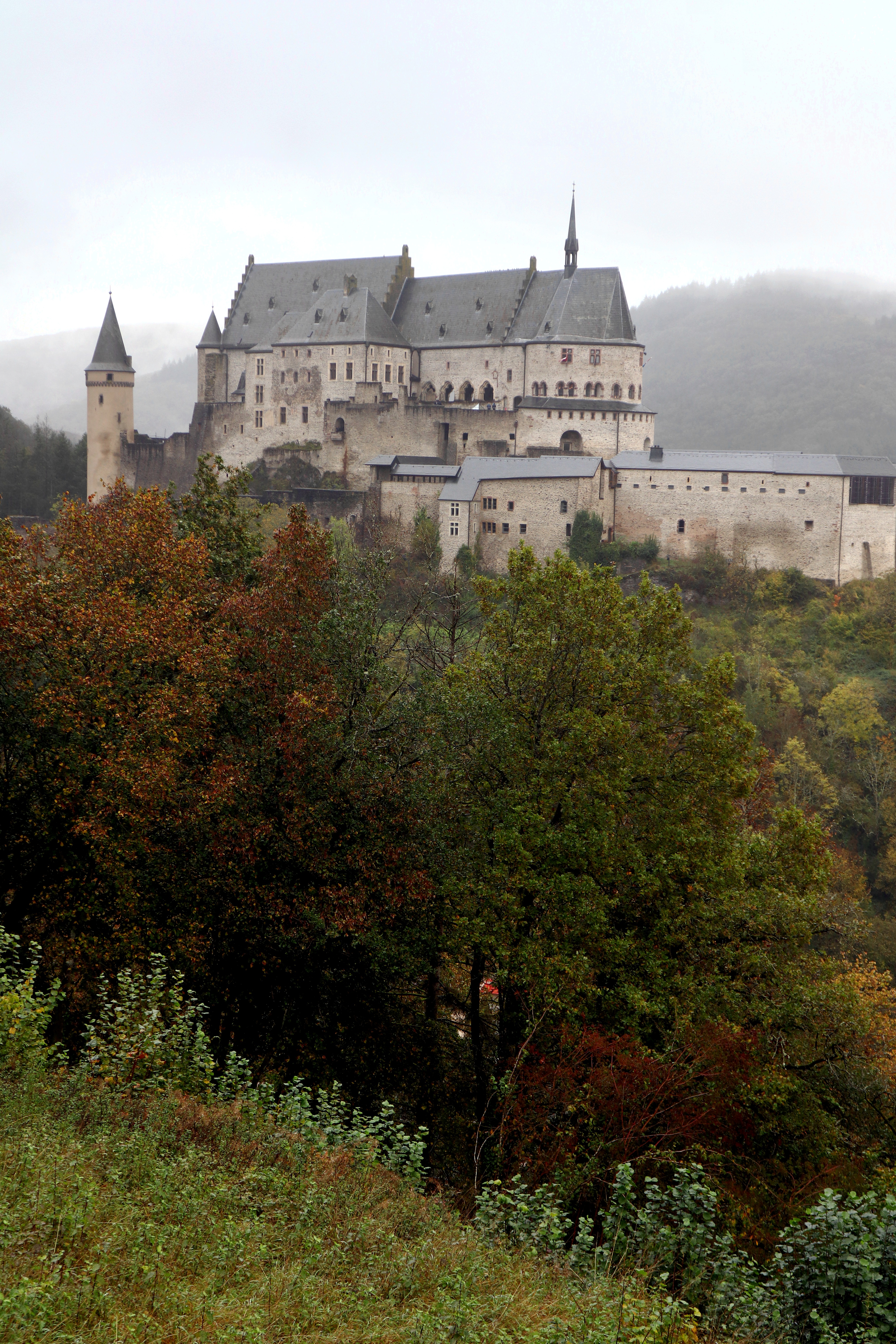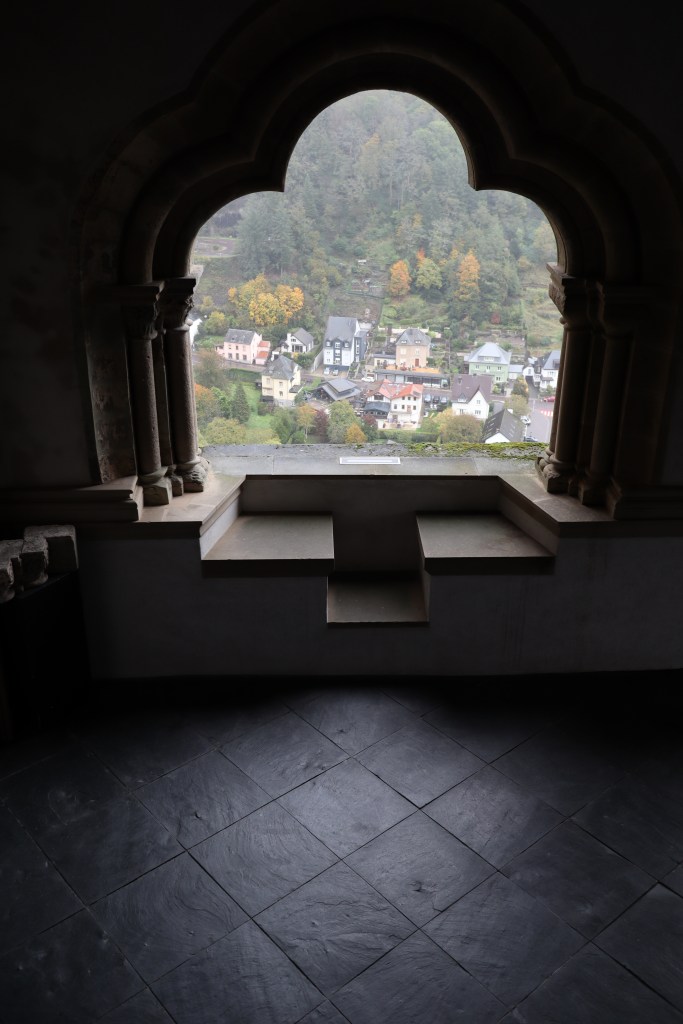 W pierwszej kolejności celem miał być Luksemburg stolica Luksemburga, ale z uwagi na pogodę czyli ciągły deszcz postanowiliśmy odwiedzić zamek Vianden tak aby zbyt wiele nie przebywać na dworze. Zamek Vianden to w opinii wielu największa i najpiękniejsza atrakcja turystyczna Wielkiego Księstwa Luksemburga. Szczerze ? Zamek robi wrażenie z zewnątrz, jest wspaniale położony a z punktu widokowego nawet przy tak dramatycznie złych warunkach pięknie się prezentuje. Bardzo fajnie jest poprowadzona trasa , ciekawe ekspozycje, emocje rosną, apetyt na następne atrakcje też, bo przecież zamek jest duży i nagle znajdujesz się na dziedzińcu gdzie orientujesz się że to koniec. Pozostaje niedosyt i z tego powodu uważam że jest to atrakcja trochę przereklamowana. Z drugiej strony nie jest to oryginalny kształt zamku tylko jego rekonstrukcyjna wizja przebudowy dokonana w latach 1979 – 1987 pod kątem turystyki. Nie zmienia t jednak jego bogatej historii bo jest ona zacna. Zamek powstał w miejscu rzymskiej wieży obserwacyjnej około XI wieku a od 1417 roku przeszedł na własność Luksemburga. W jego bryle można wyróżnić elementy romańskie, gotyckie i renesansowe. Sam Luksemburg a raczej jego stolicę chcemy odwiedzić przy lepszej pogodzie choć mój entuzjazm trochę opadł. Na pewno jest tu ciekawie krajobrazowo ale zabudowa miasteczek i miejscowości jest taka jakaś nijaka , bez ikry, bez ekscytacji jaką odczuwam w podobnych miejscach w Niemczech , brak jakiejś wyrazistości czy własnego stylu. No ale trzeba dać mu szansę i jakiś szlak tam zaliczyć bo topografia zapowiada się ciekawie.