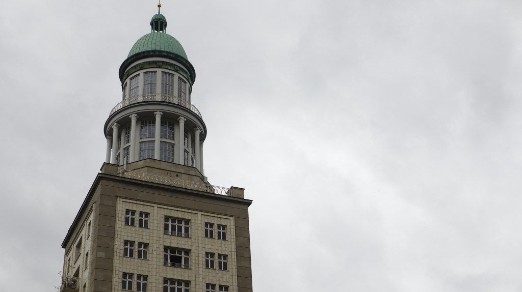 Miejscem docelowym była socrealistyczna zabudowa Karl-Marx-Allee. Od wielu lat to miejsce mnie intryguje. To obecnie chyba największy Mi znany kompleks socjalistycznej urbanistyki. Plany jej powstania sięgają roku 1949 i to jeszcze przed powstaniem Niemieckiej Republiki Demokratycznej. Budowano ja na gruzach zniszczonej w 1945 roku dzielnicy Friedrichsheim. Początkowo nosiła nazwę Frankfurter Allee ale 1949 roku przemianowano na aleję im.Stalina i jak się okazało że jednak On niedobry był , w 1961 roku nadano jej dzisiejszą nazwę. Podczas budowy złe warunki pracy oraz niskie wynagrodzenie spowodowały niezadowolenie i zamieszki stłumione krwawo przez komunistyczną władzę w 1953 roku. Karl-Marx-Allee to ważna do teraz arteria komunikacyjna a wcześniej reprezentacyjne miejsce. Odbywały się na niej defilady, marsze i świętowano ważne wydarzenia NRD. Długość od stacji metra Frankfurter Tor, gdzie stoją charakterystyczne wieże do Aleksanderplatz wynosi około 3 kilometrów szerokość 150 metrów. Budynki są wysokie na 6 – 8 pięter, elewacje pokryte są kaflami ceramicznymi. W chwili obecnej nie jest postrzegana jako spuścizna socjalistycznego systemu tylko obiekt architektoniczny i to się Niemcom chwali.